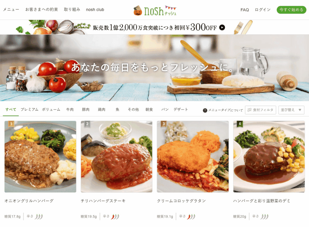 | nosh(ナッシュ) | 全国(離島含む) | 個人(健康志向・若者) | 低糖質・60種以上メニュー | ¥600/食前後 | 定期便、送料¥1,705~ |