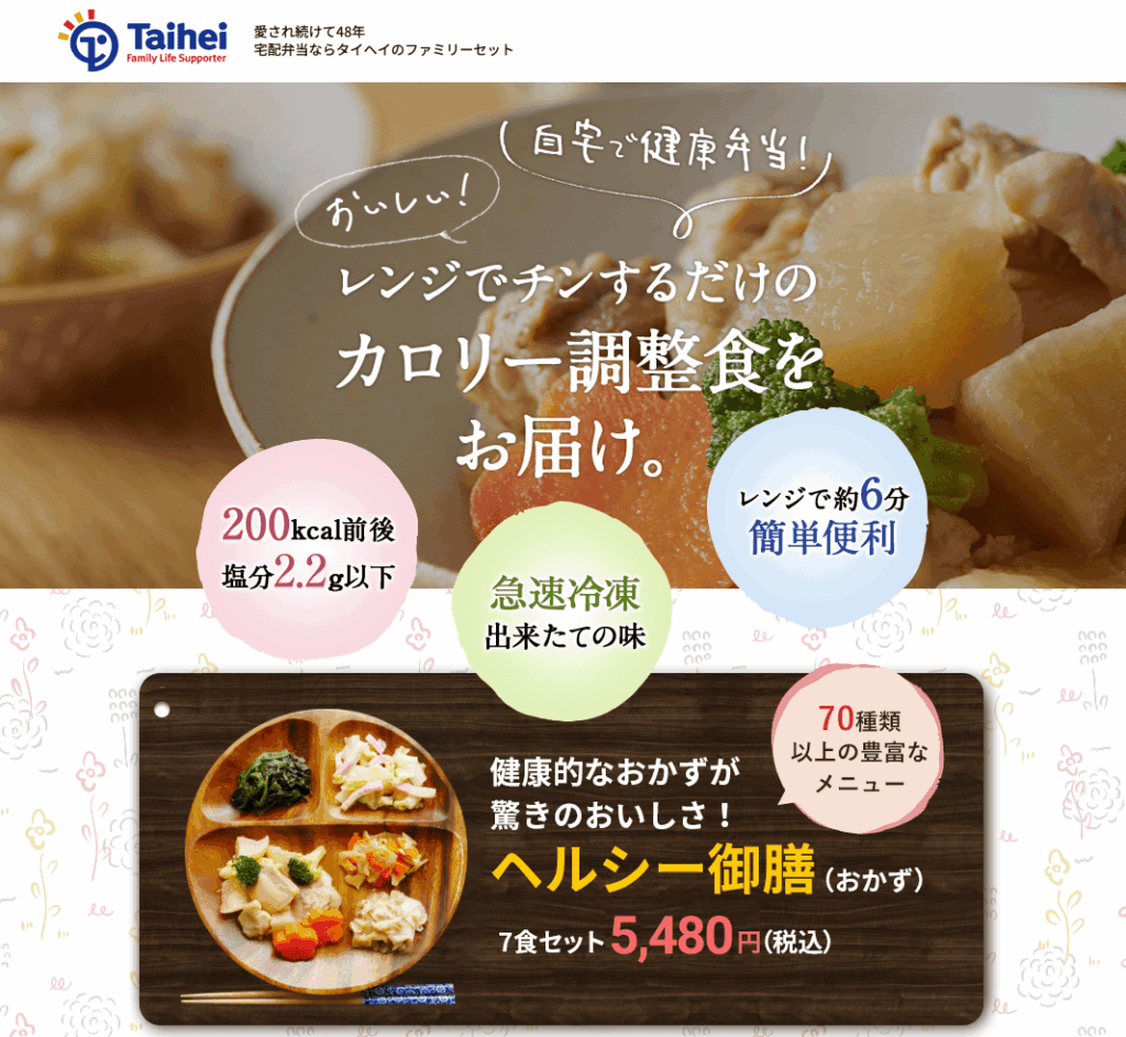 | タイヘイファミリーセット | 全国 | 個人(健康志向・制限食が必要な方 | 糖質・塩分・カロリー調整食、冷凍 | ¥500~¥700/食 | セット販売(7食~)、定期購入あり、送料¥780~ |