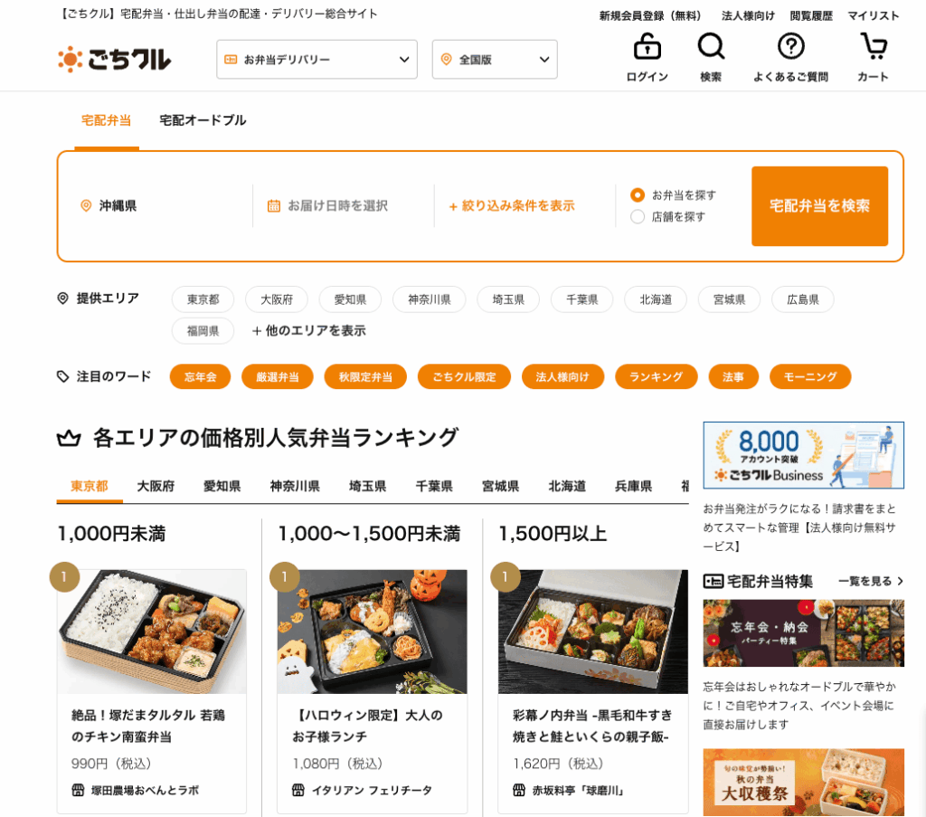| ごちクル | 全国 | 法人・団体 | 高級弁当、会議・接待向け、豊富なメニュー | ¥800~¥3,000/食 | 5食以上から注文可、配達エリア・条件は地域により異なる |