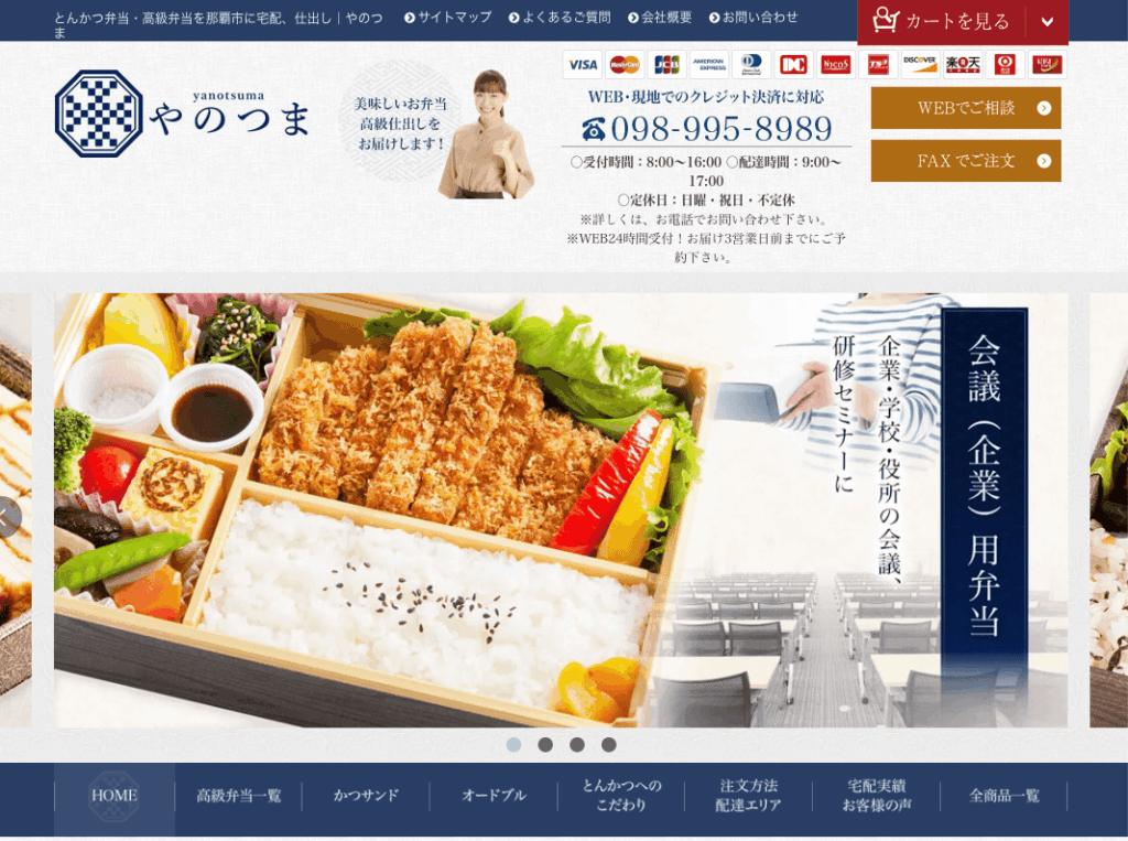 | やのつま | 沖縄の各都市部 | 法人・団体・個人 | 高級弁当、とんかつ専門、オードブル対応 | ¥1,200~¥1,680/食 | 最低注文金額¥5,000~、配達エリアにより異なる |