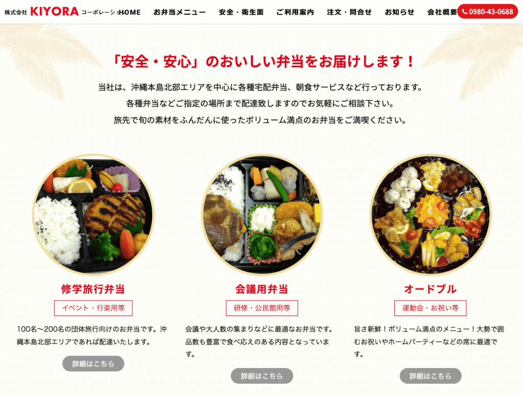 | KIYORAコーポレーション | 沖縄本島北部 | 団体(修学旅行・会議) | 修学旅行弁当、会議用、オードブル、朝食サービス | 要問い合わせ | 100名~200名の団体向け、配達エリア限定 |