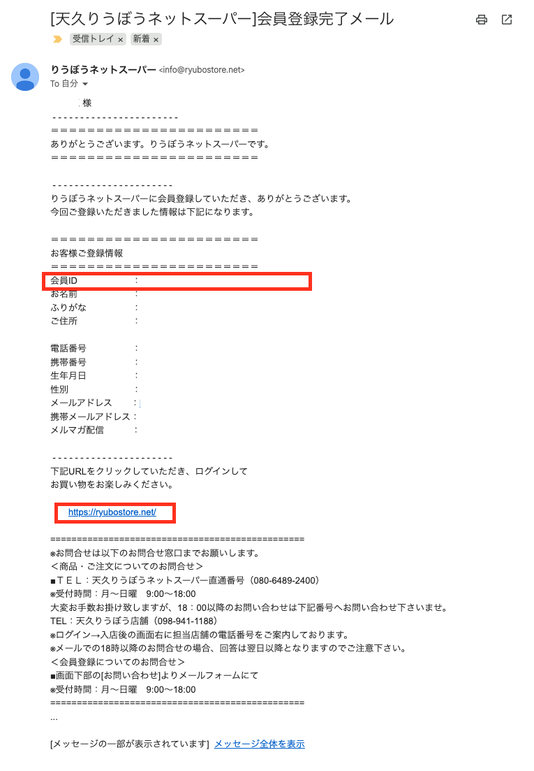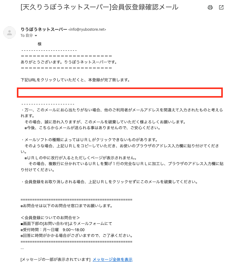 仮登録後、登録したメールアドレスに以下のようなメールが届くので、赤枠のリンク「https://ryubostoore…….」をクリック!