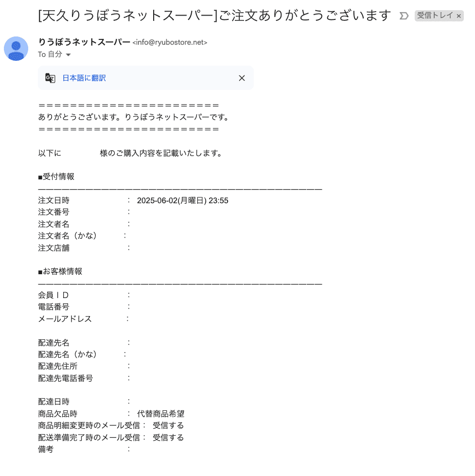 以下のメールが届いていれば、注文は完了です。