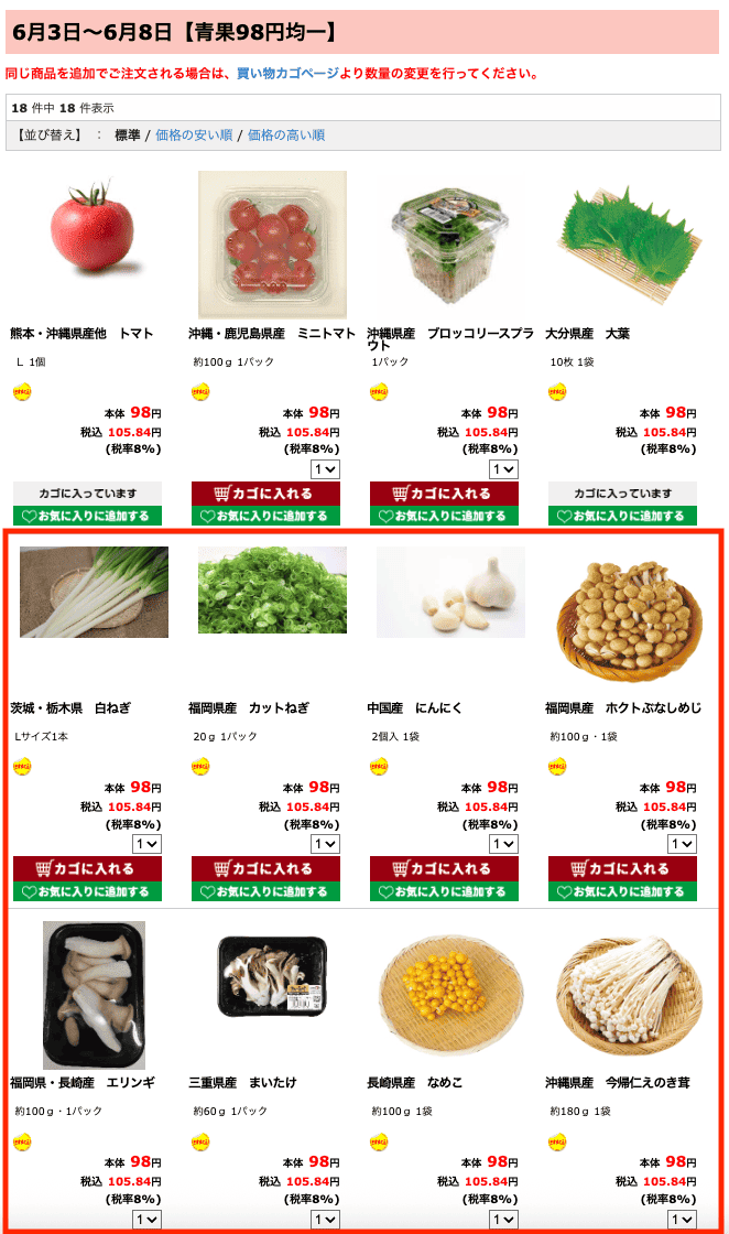 このような画面に来たら、購入したい商品をカゴに入れていきましょう。